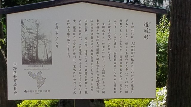 文明9年(1477年)、江古田原・沼袋合戦のとき、太田道灌が戦勝を祈願して境内に植樹した杉の根が残っています。