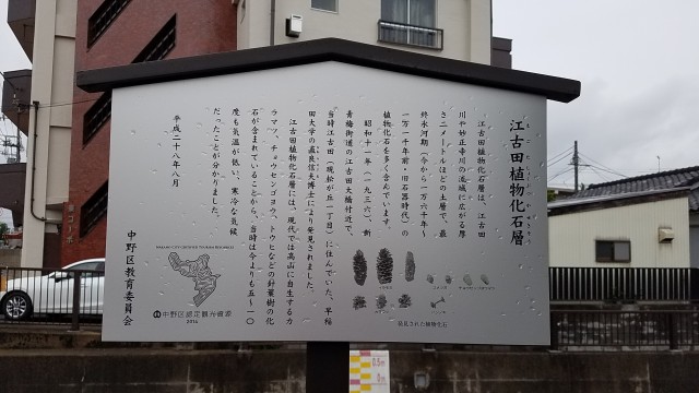 この付近では、昭和11年に水道管埋設工事が行われたときに、旧石器時代にあたる最終氷河期(16000~11000年前)の植物化石を多数含んだ土層が発見されました(江古田植物化石層・・・地下2m前後にある厚さ2m程度の土層)。