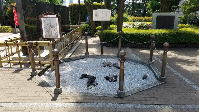 なお、交差点の北西側(セブンイレブンのエリア)からは兜、腐った刀、人骨が、東南側(下の画像を撮影したエリア)からは馬骨が出土されたが、何故かいずれも現存していないそうです。