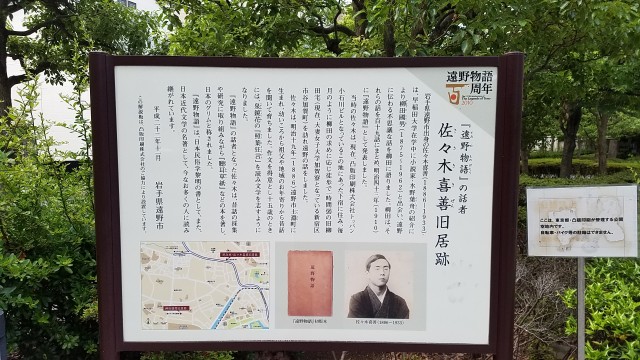 遠野物語の話者 佐々木喜善旧居跡(東京都文京区水道1-1-8トッパンホール裏)。