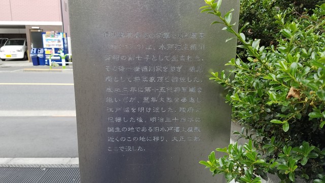 慶喜公は、神田上水の給水が完全に停止した明治34年、大久保長門守下屋敷跡に移り住み、大正2年(1913)11月22日、急性肺炎のためこの地で没した。