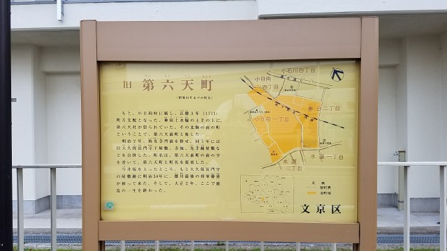 第六天町には、徳川家最後の将軍である徳川慶喜公終焉の地(東京都文京区春日2-8-9 国際仏教学大学院大学内)がある。