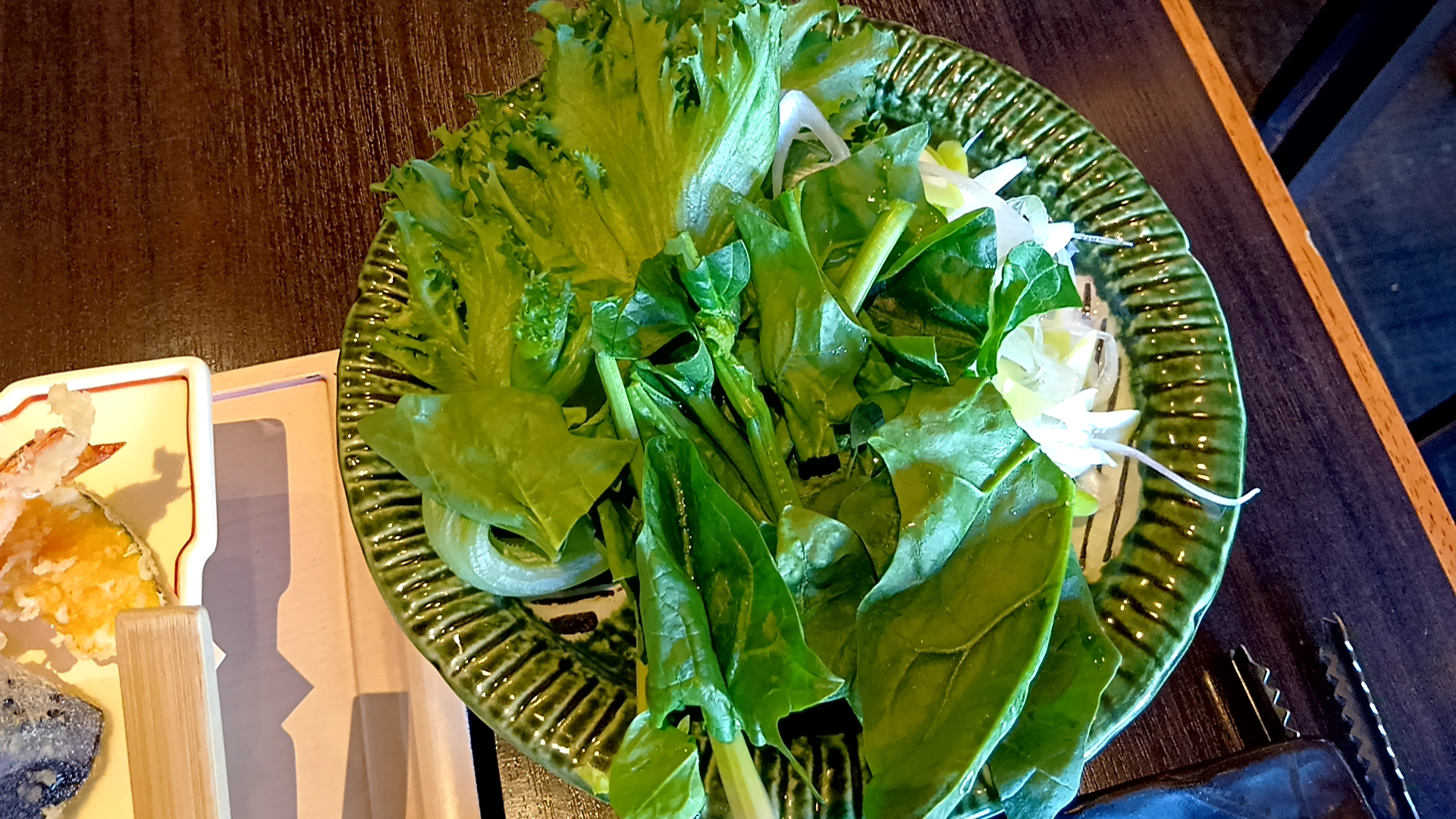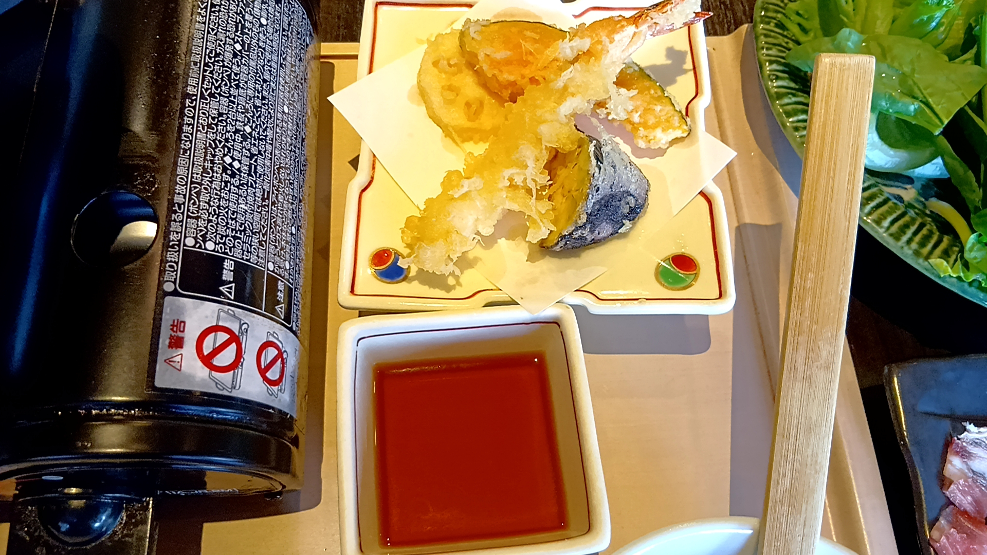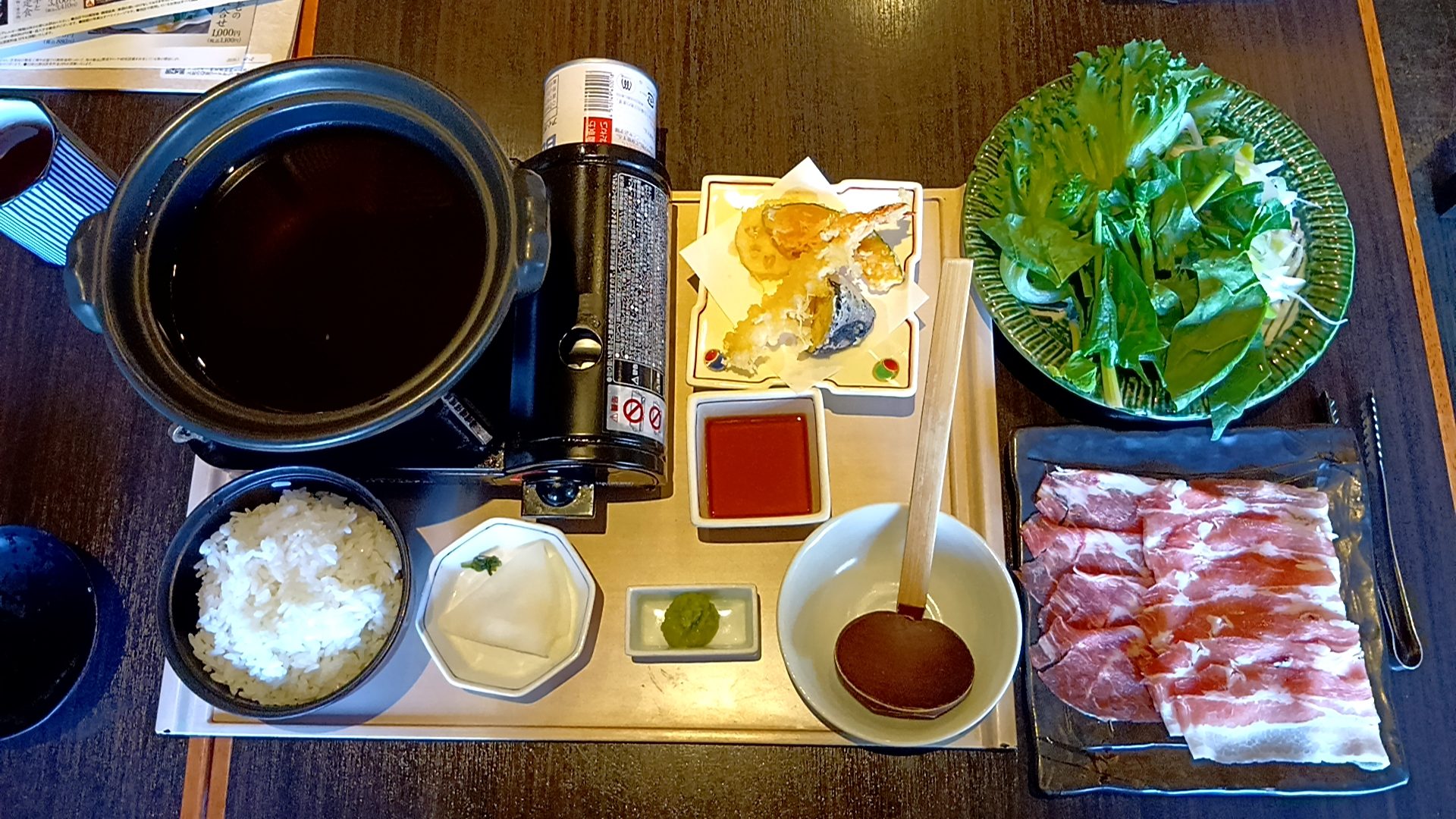 野菜盛り合わせ・天ぷら・ご飯・香の物・つゆだし(鍋)・柚子胡椒セット
