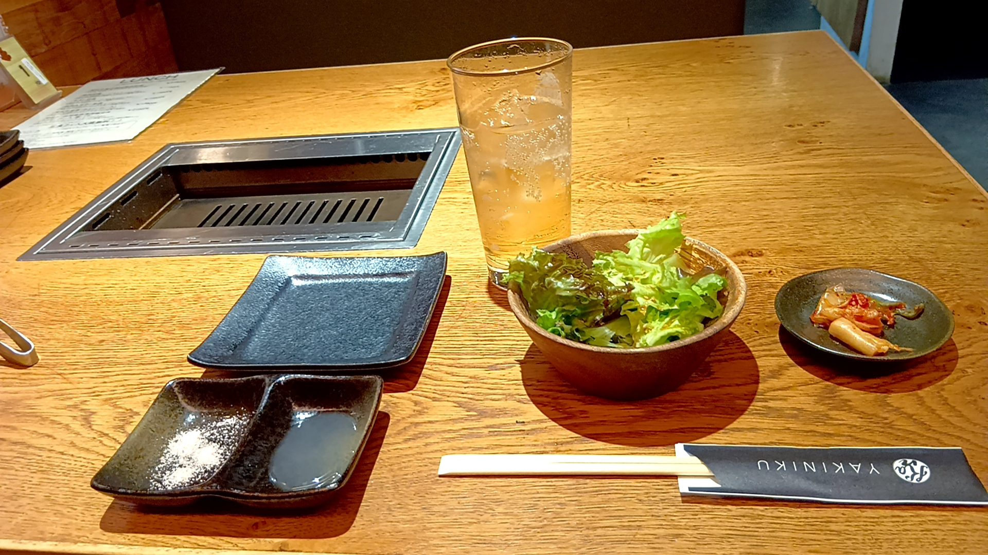 先付けキムチとサラダ、そしてサービスドリンクのジンジャエール