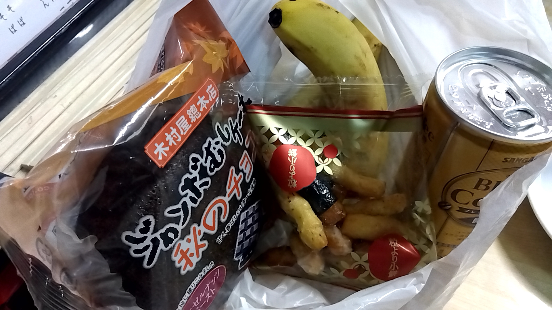 ④手土産サービス(木村屋總本店ジャンボむしケーキ”秋のチョコ”・せんべい・バナナ・缶コーヒー)