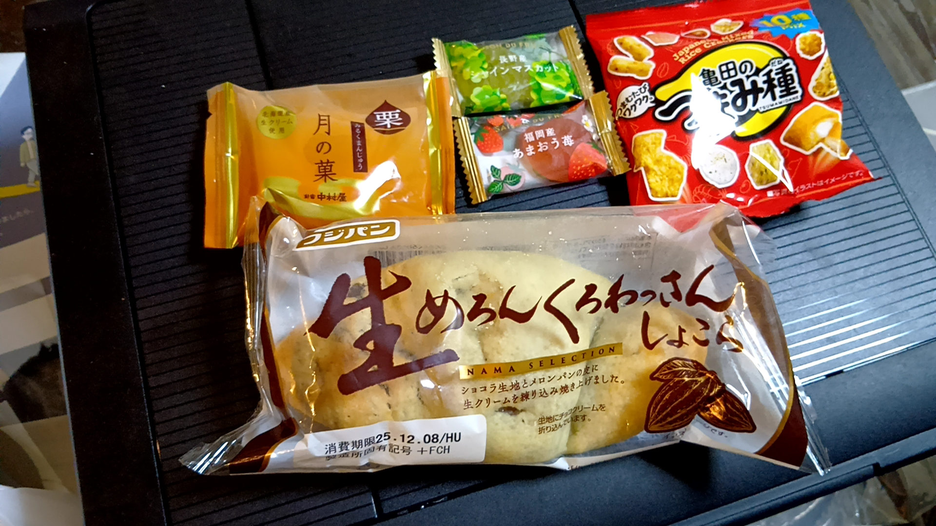 ⑤手土産サービス(生めろんくろわっさんしょこら・栗月の菓・亀田のつまみ種・シャインマスカットグミ・あまおうグミ)