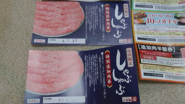 上落合店発行「しゃぶしゃぶ/すきやき特別追加肉券」(静岡県産和牛霜降120g) サービス