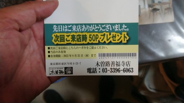 ただし、善福寺店限定50ポイントサービスハガキを忘れた。