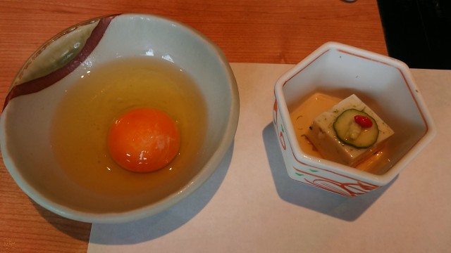 席に戻ると、先付け豆腐と玉子が提供されていた。