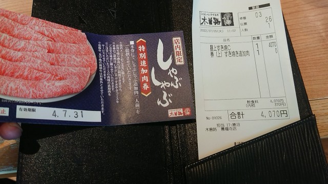 上落合店発行「しゃぶしゃぶ特別追加肉券」サービス利用(静岡県産和牛霜降120g) pic.twitter.com/ivYcmaJ9VO— 松本祐徳 (@miyazakitei) July 5, 2022