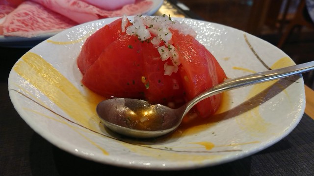 割下と玉子で口の中が飽きてくるので、口直しのため用意されたトマトサラダです