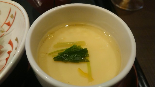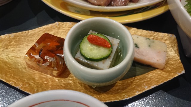 ①前菜(河豚煮こごり・なめこ豆腐・荏胡麻桜海老真薯)