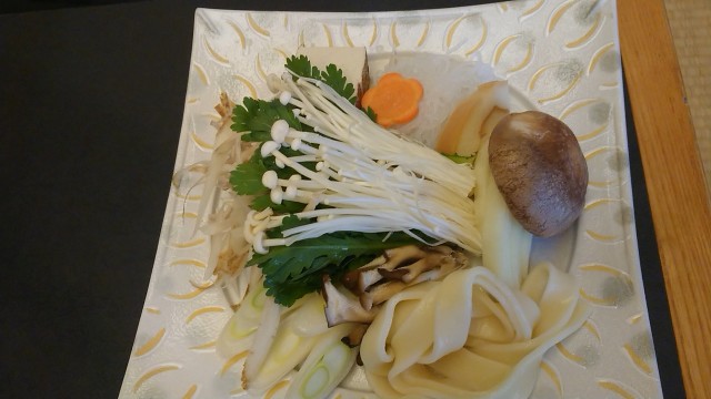 長ネギ、タマネギ、えのき茸、牛蒡、ニンジン、しいたけ、春菊、焼き豆腐、お麩、しらたき、きしめん