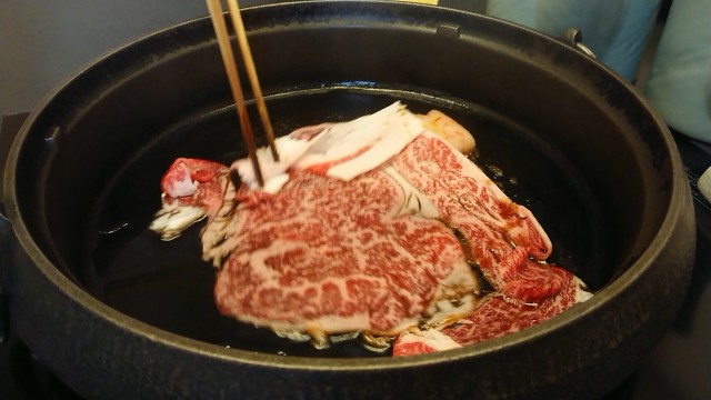 牛脂、割下、昆布出汁(こぶだし)を入れて和牛焼き!