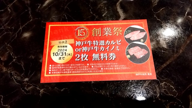 ②15th創業祭神戸牛特上カルビ2枚無料券
