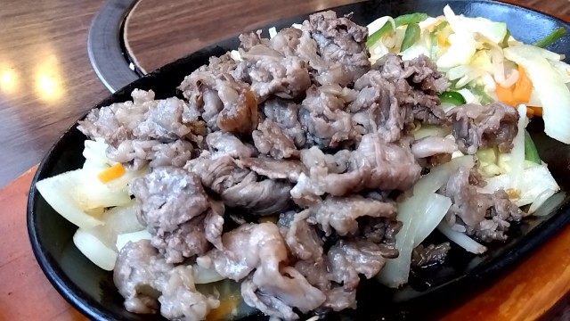 ①黒毛和牛鉄板焼М120g(からし醤油タレ) 2200円