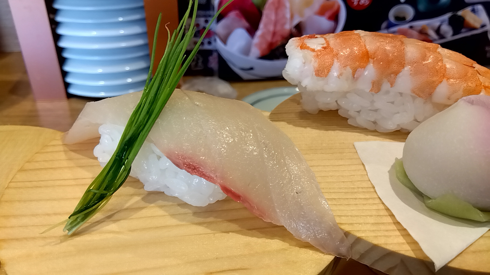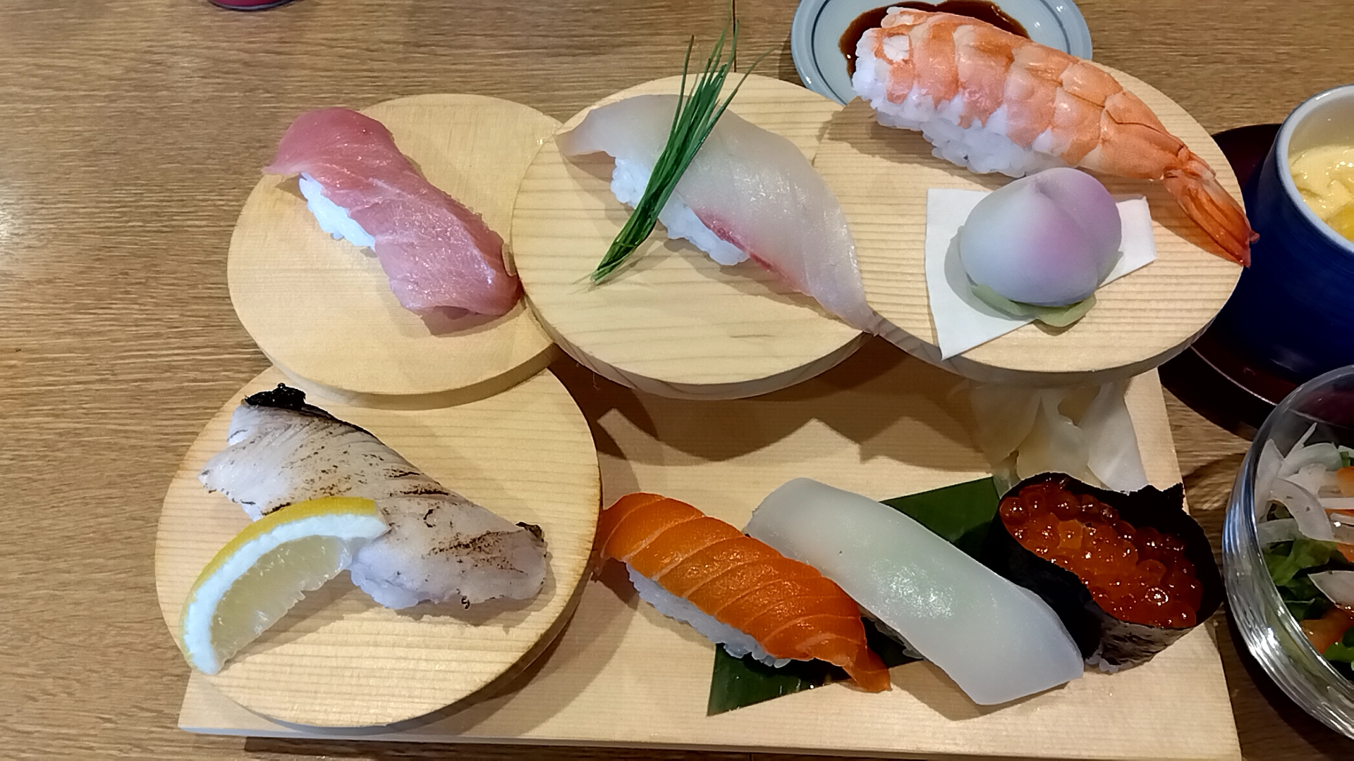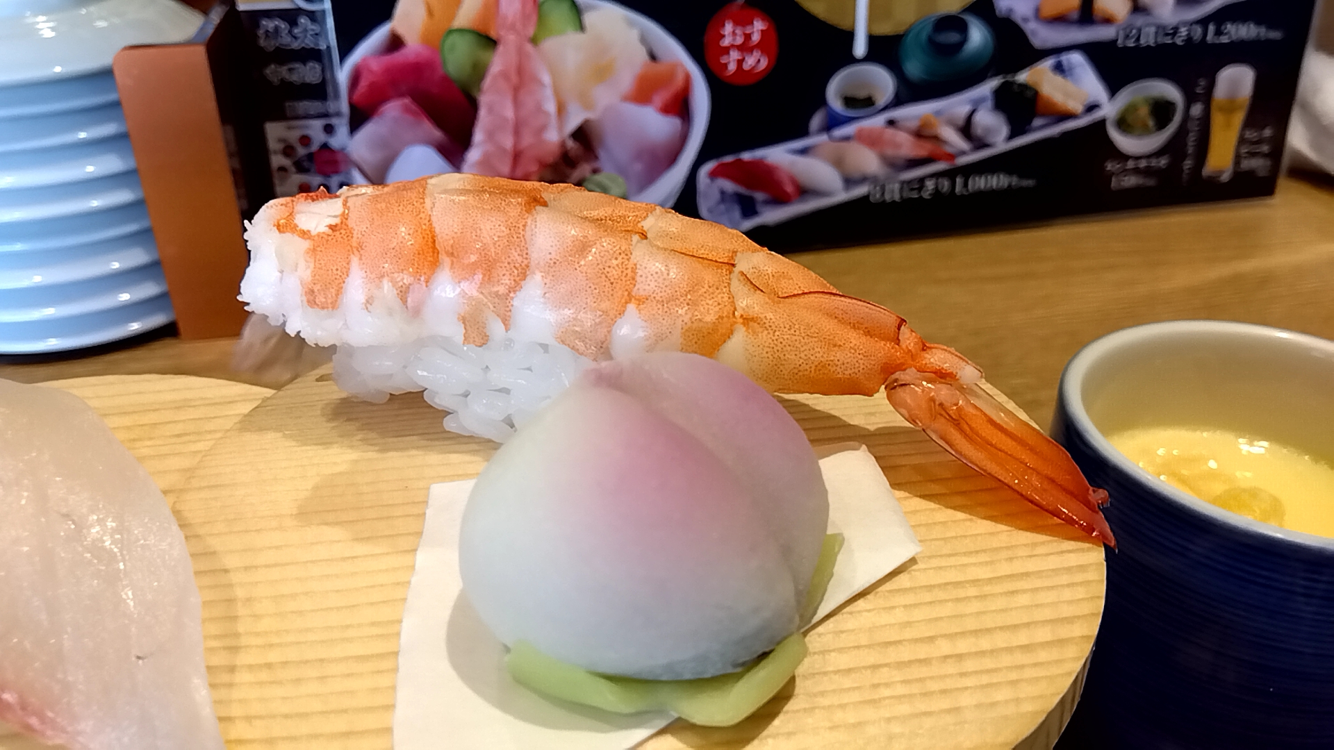 上段)中トロ・かんぱち+芽葱・海老+桃饅頭