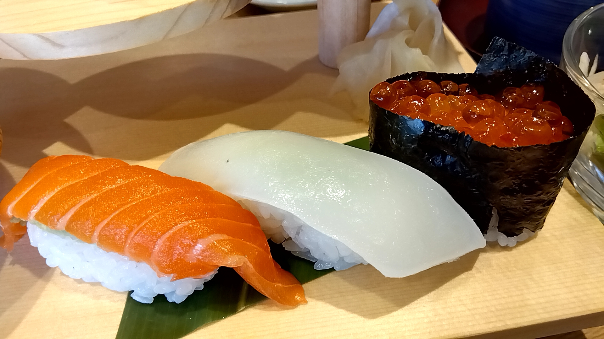 下段)鰆炙り・サーモン・烏賊・いくら軍艦