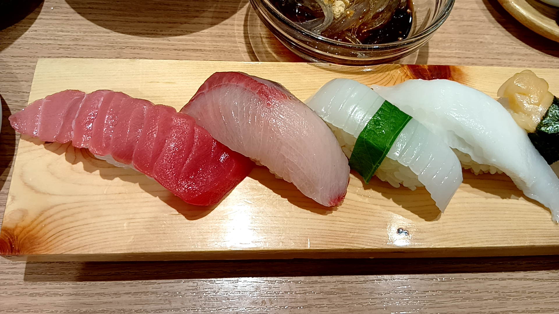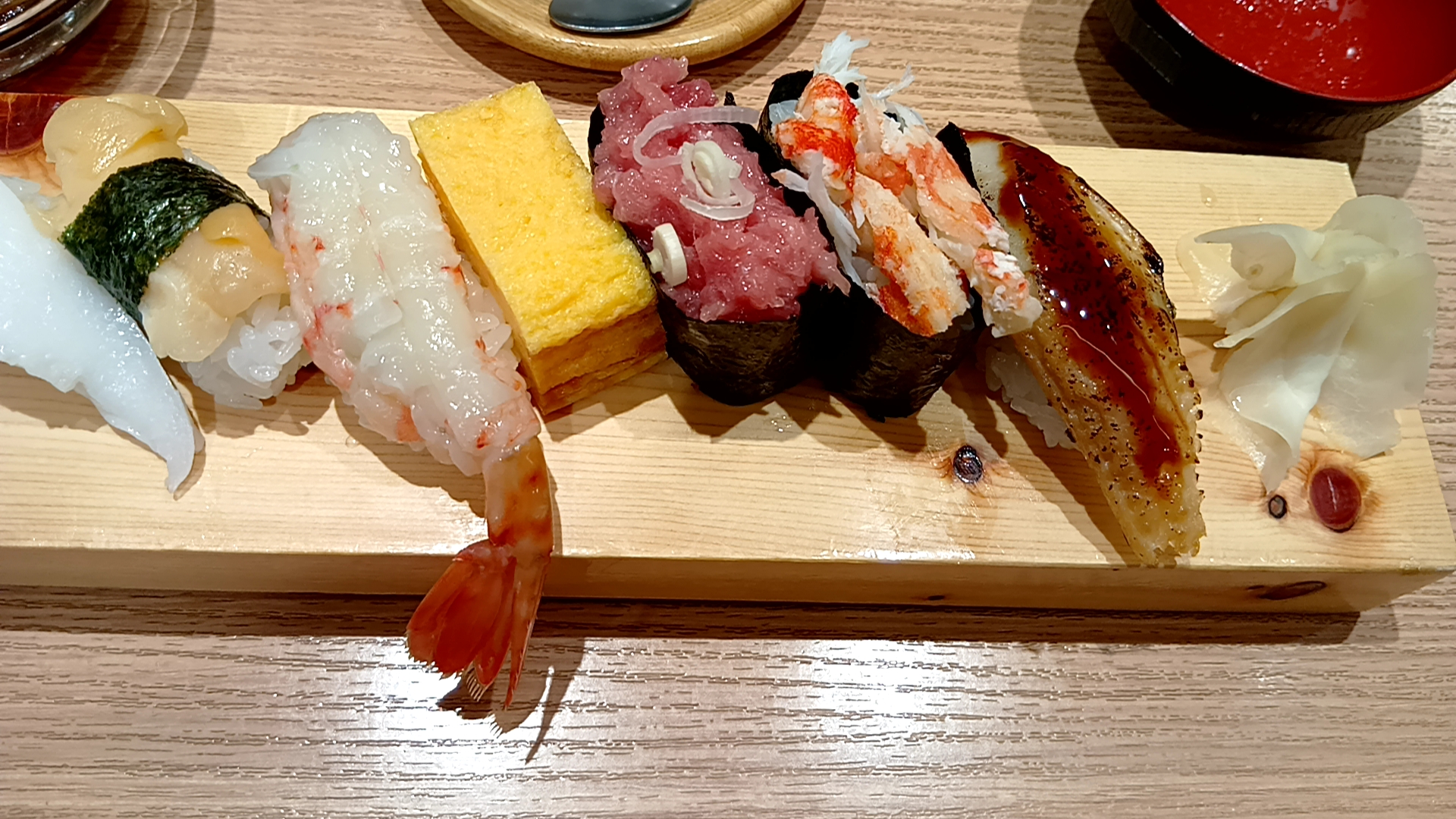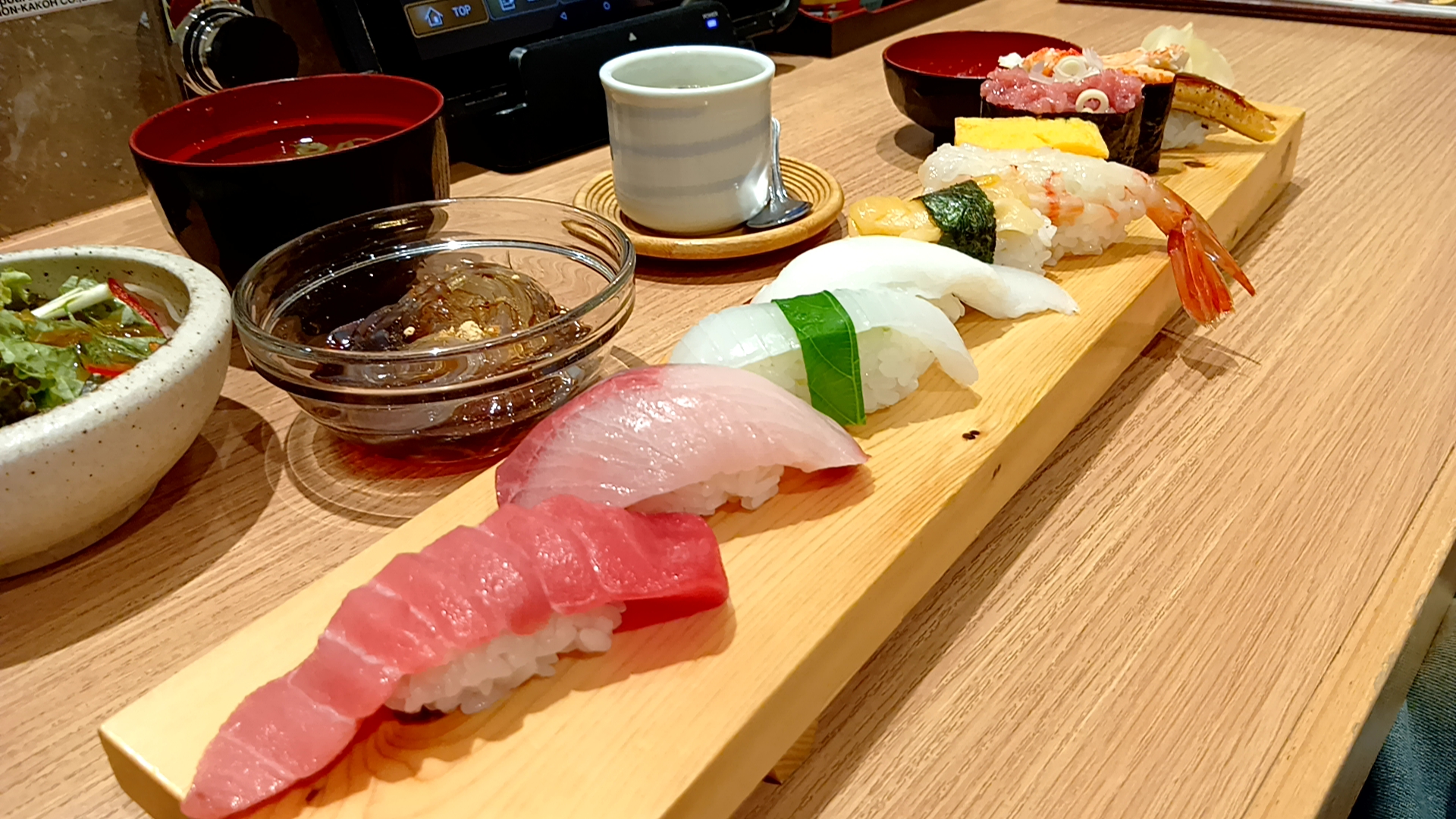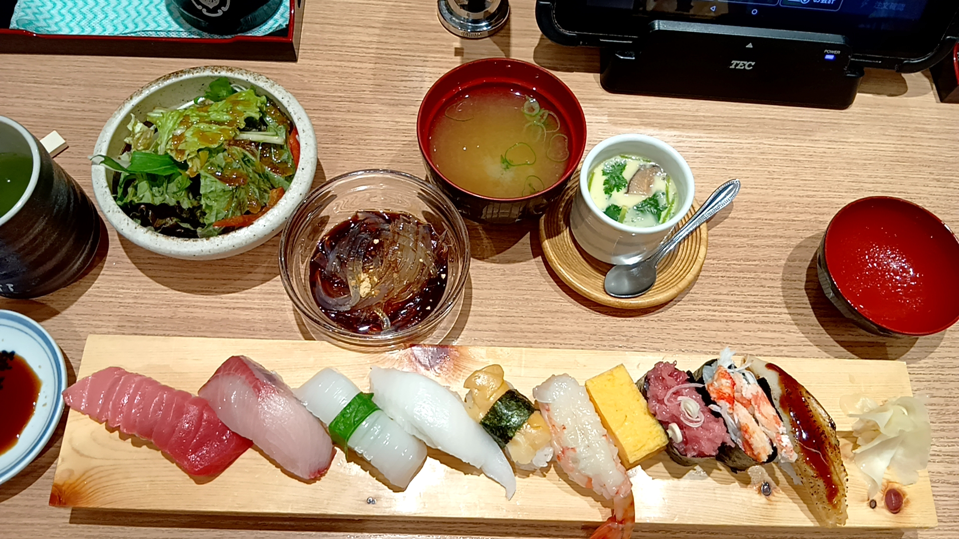 中とろ・かんぱち・烏賊・えんがわ・帆立・赤えび・玉子・ねぎとろ軍艦・ほぐしかに軍艦・穴子