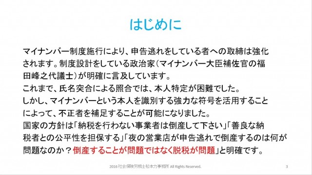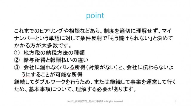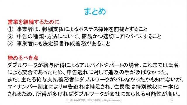 マイナンバー制度が施行される前からいろんなところで「ダブルワークがバレる」「過去の申告漏れが捕捉される」「家族にバレないか心配」「ホステスが辞めていく」等の相談を受けてきた。