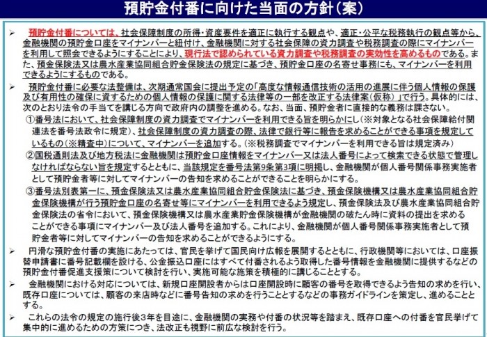 預貯金口座へのマイナンバー付番に必要な法整備は、平成27年通常国会に提出予定の「高度な情報通信技術の活用の進展に伴う個人情報の保護及び有用性の確保に資するための個人情報の保護に関する法律等の一部を改正する法律案(仮称) 」で行う。