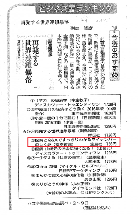 【宝島社『図解とQ&Aですっきりわかるマイナンバーのしくみ』】河北新報社調べ週刊ベストセラービジネス部門第5位ランクイン 2015/11/24