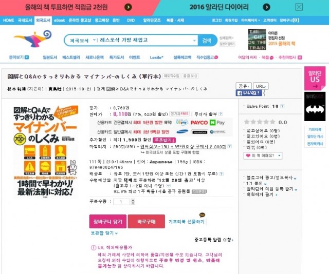 韓国のネット書店で扱われています。 びっくり! たくさん売れるといいな。 [알라딘]圖解とQ&Aですっきりわかる マイナンバ-のしくみ (單行本)