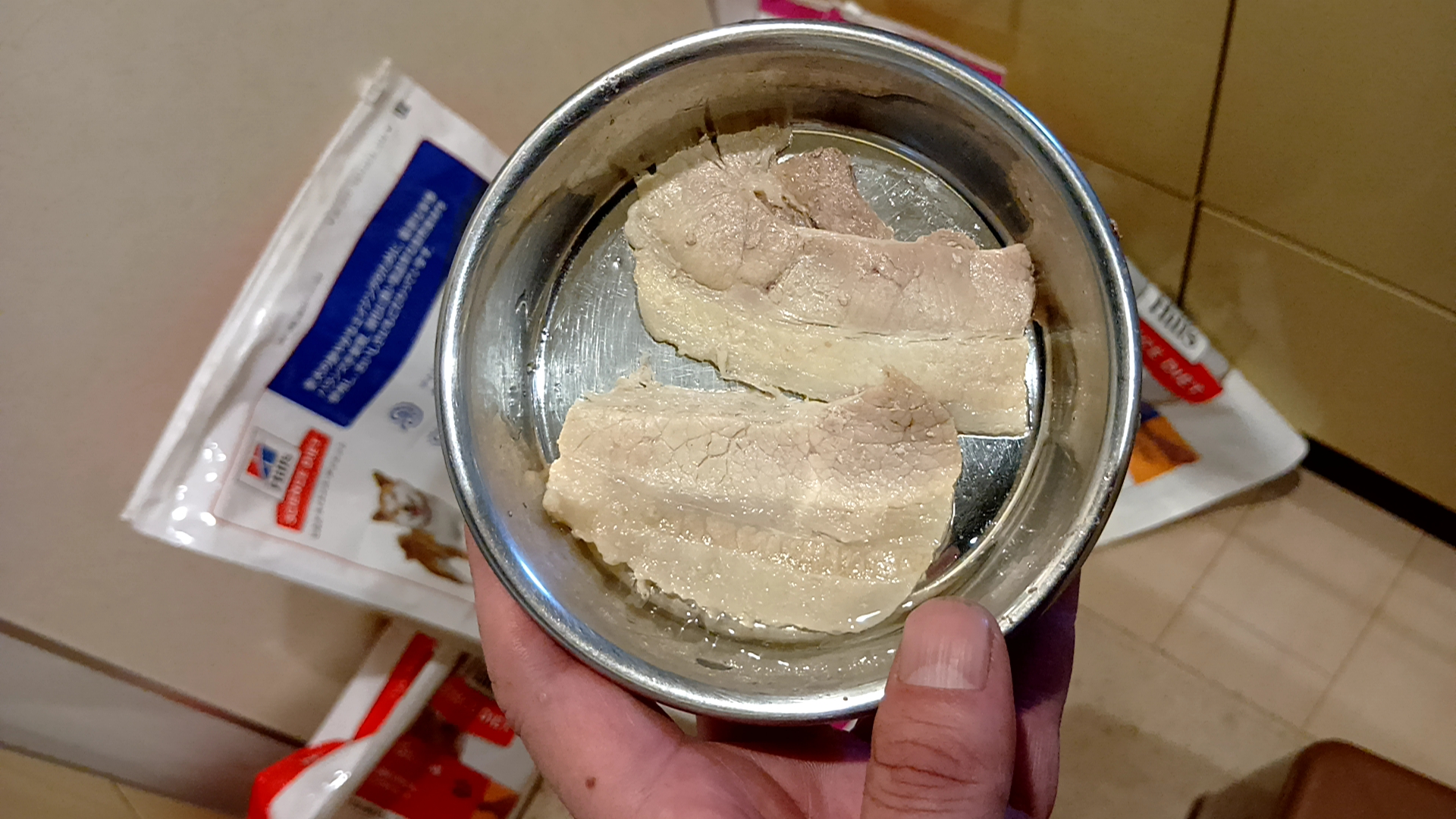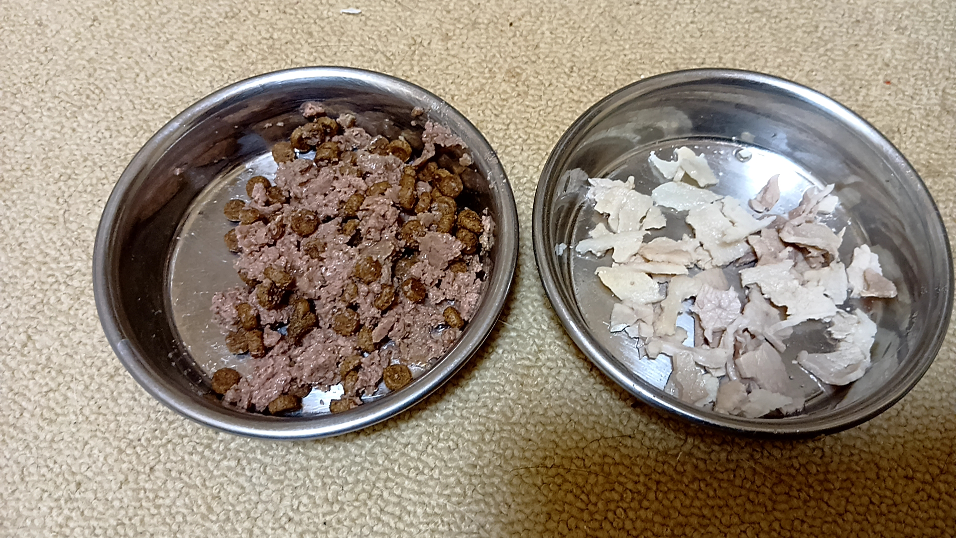 プリンスのいる部屋に2皿に分けて持ち込んだときは、ドッグフードを完食後、豚しゃぶを給餌するようにしている。