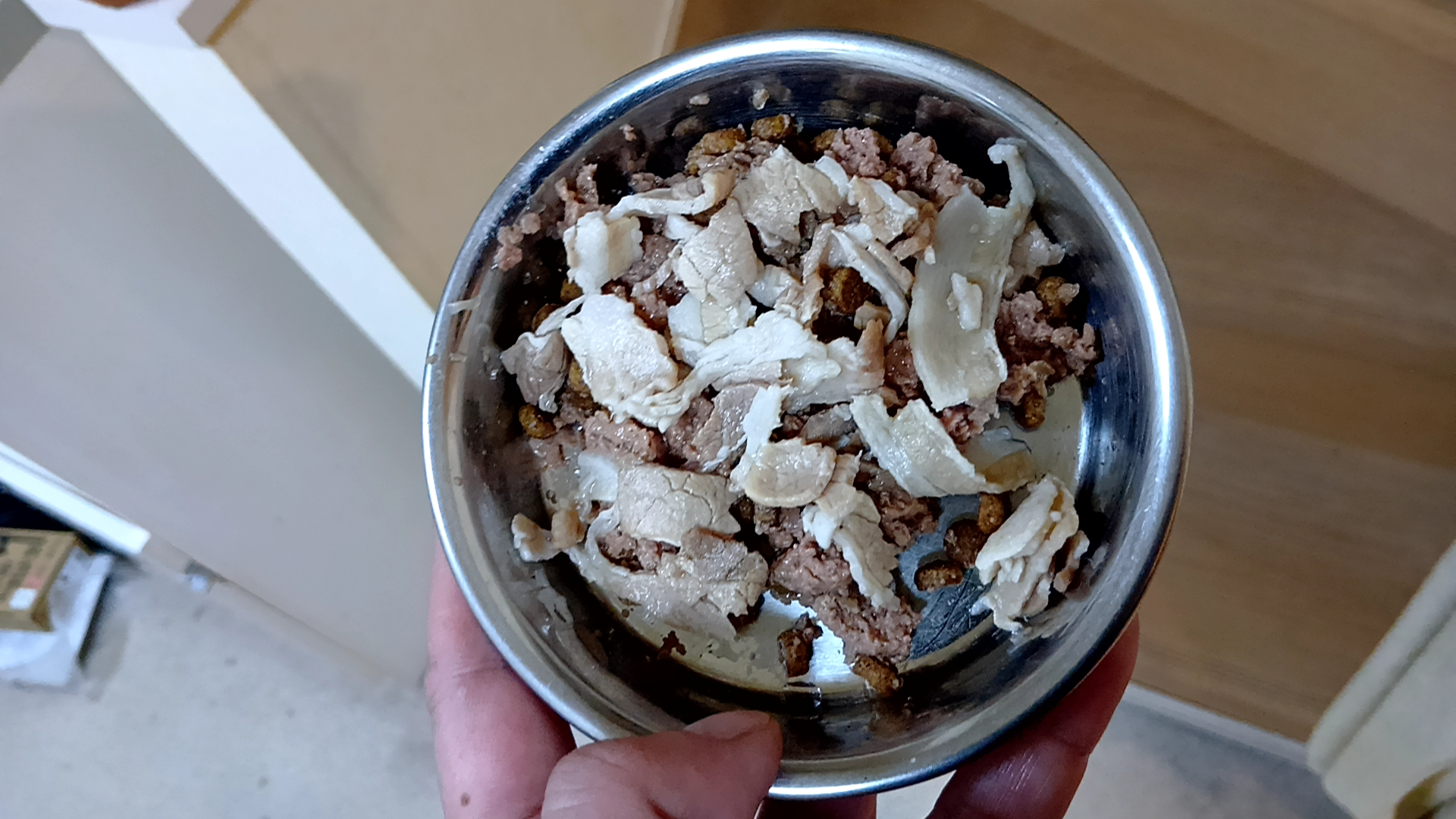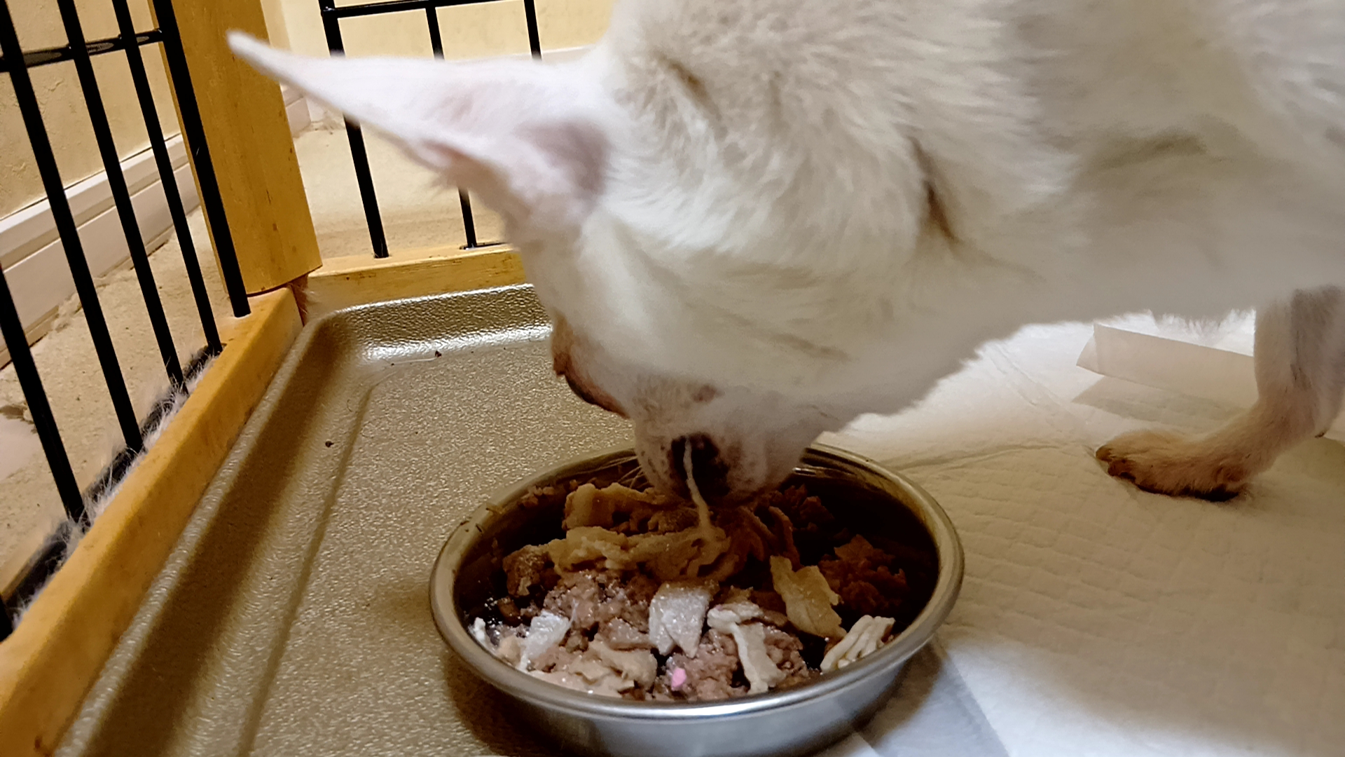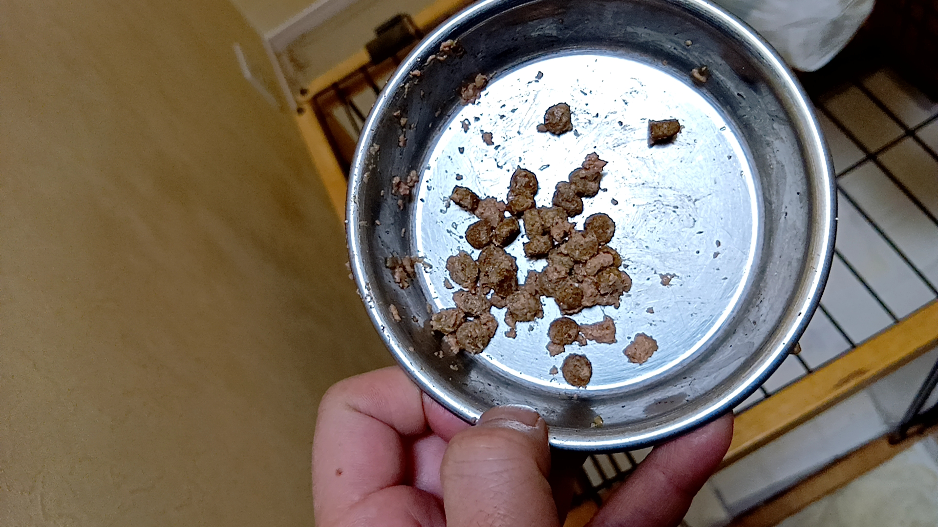 ドライフードとウェットフードを食べ残したので、ウェットフードだけは手で給餌した。