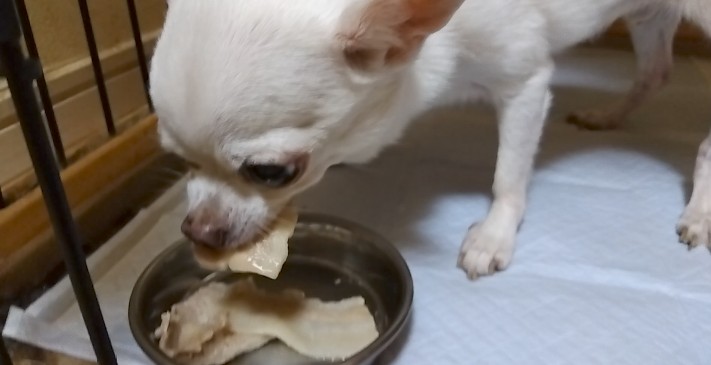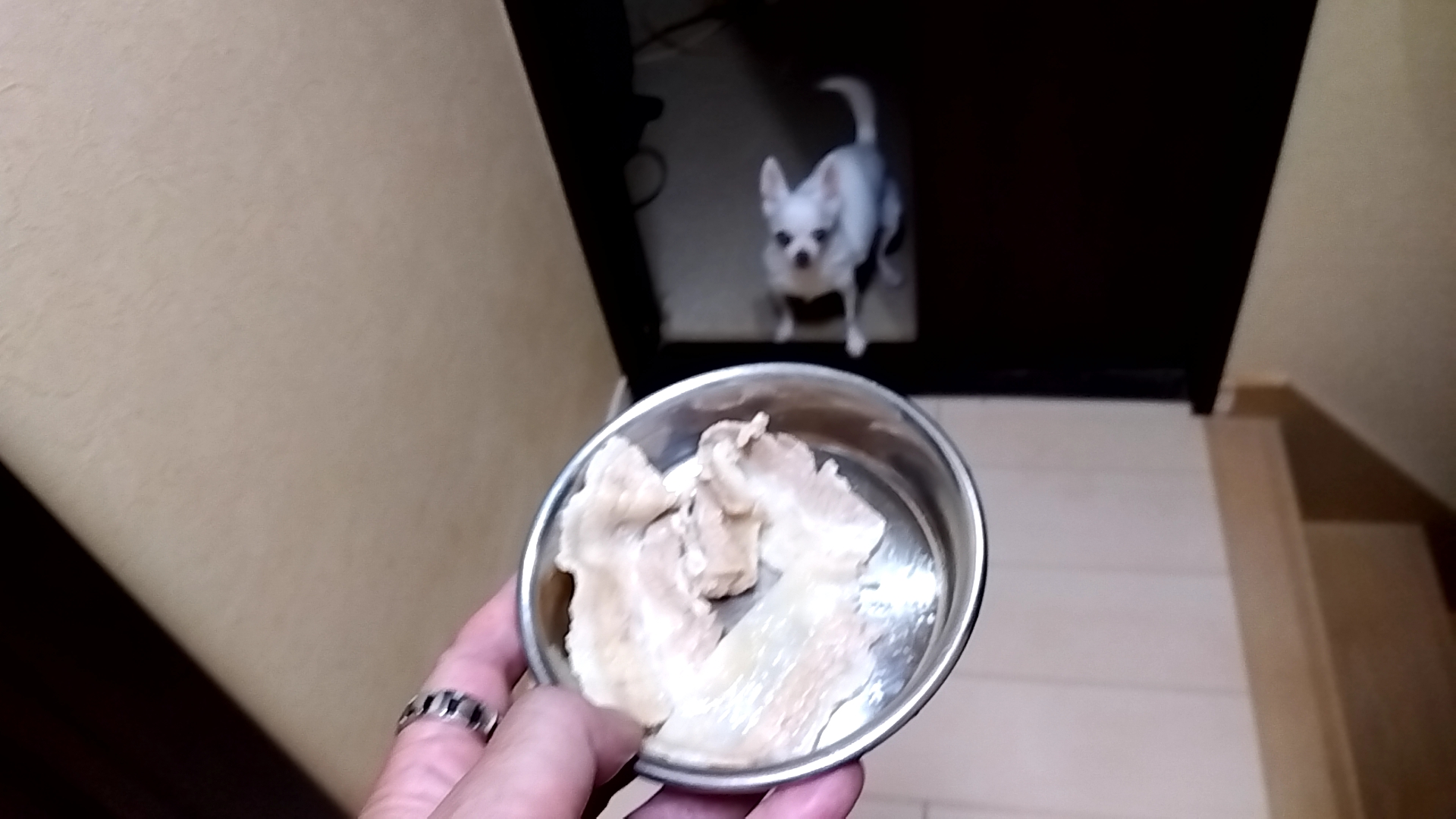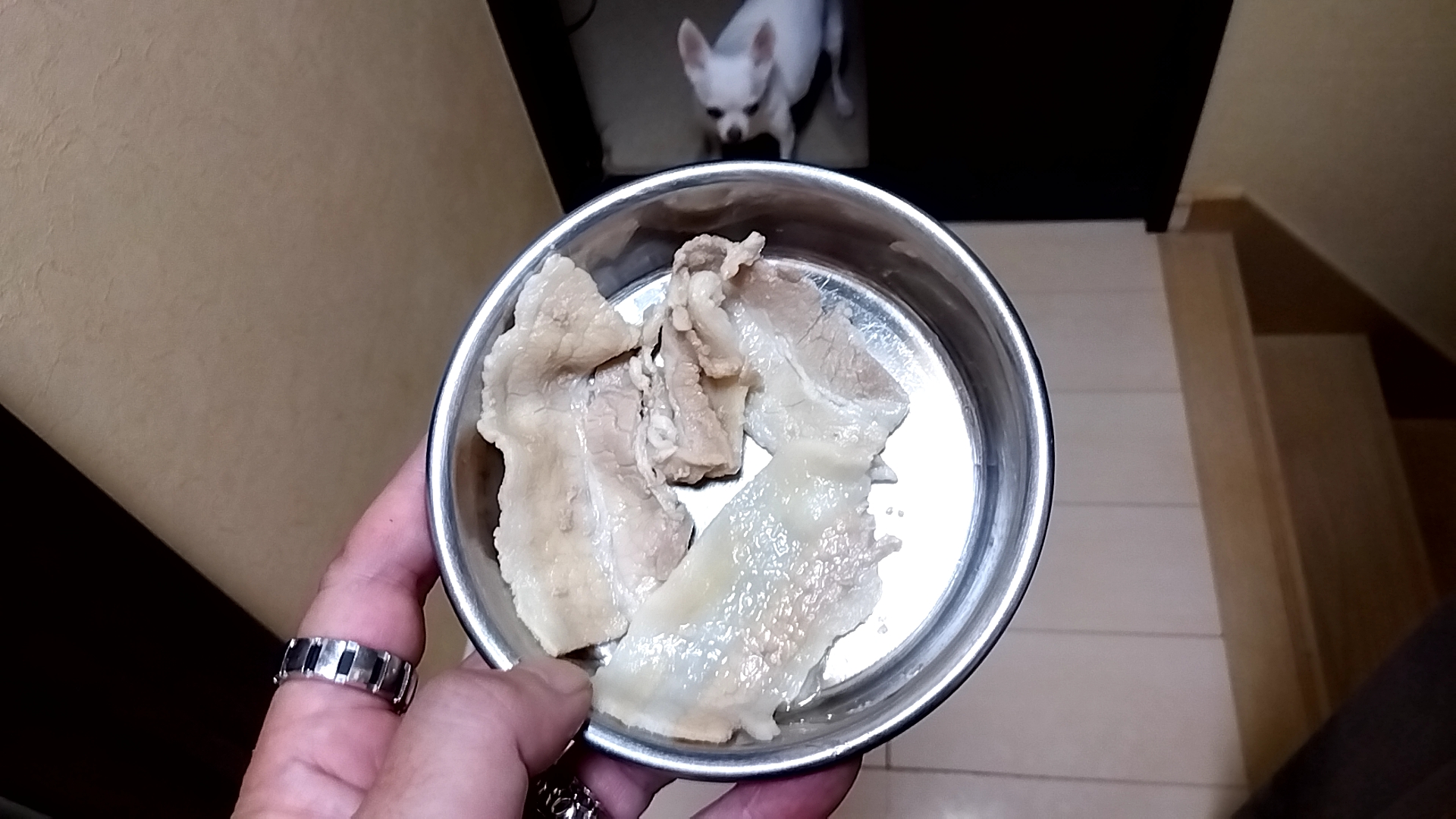 帰宅後、直ぐに、豚肉を水で濯いでプリンスにご褒美です!