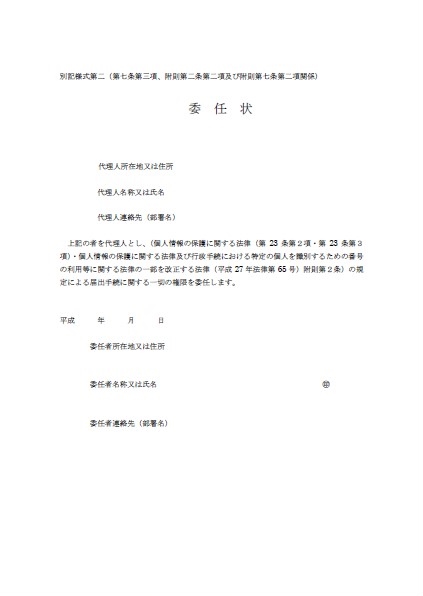 ロ 個人情報取扱事業者が、代理人によって届出を行う場合(施行日前に届出を行う場合を含む。)には、別記様式第2によるその権限を証する書面(電磁的記録を含む。以下同じ。)を委員会に提出しなければならない。【則第7条第3項、則附則第2条第2項、則附則第7条第2項】