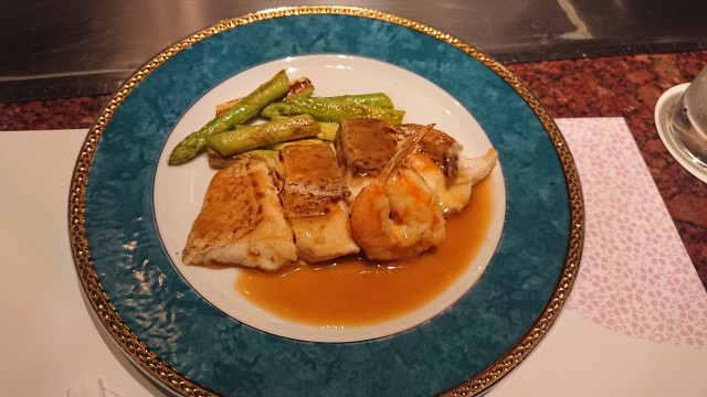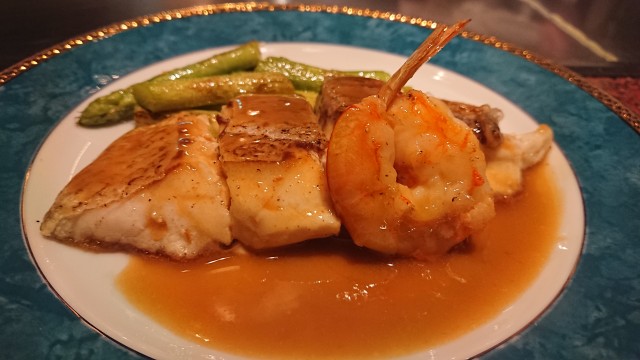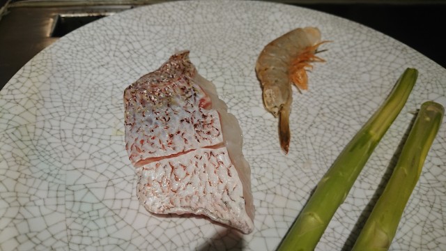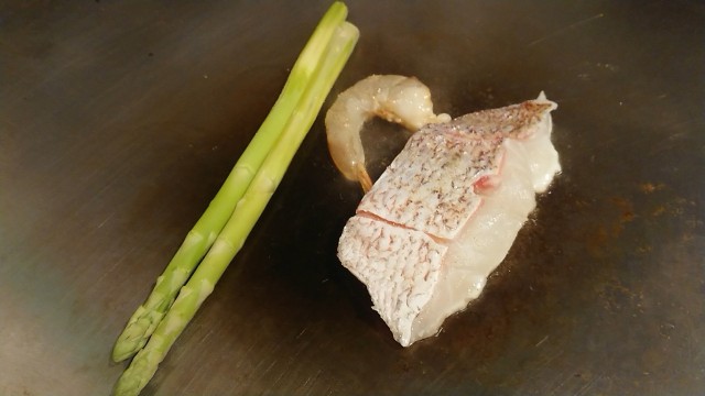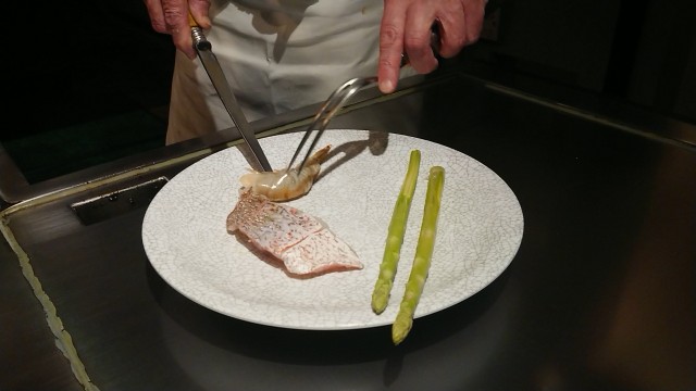 ホワイトタイガーエビと千葉県産真鯛とアスパラガスの鉄板焼き(バター醤油仕立て) 3500円
