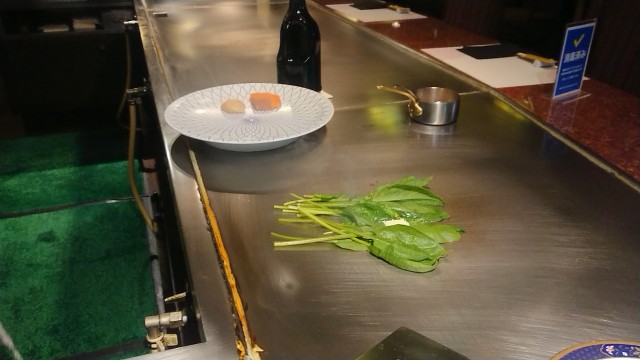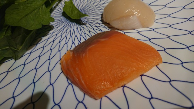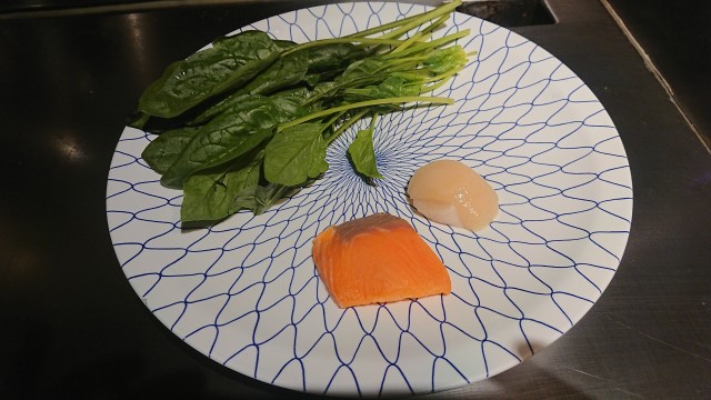 帆立とサーモンとほうれん草の鉄板焼き