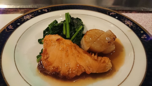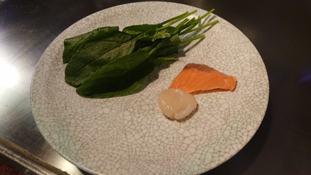 ③青森県産帆立貝とノルウェー産サーモンとほうれん草の鉄板焼き