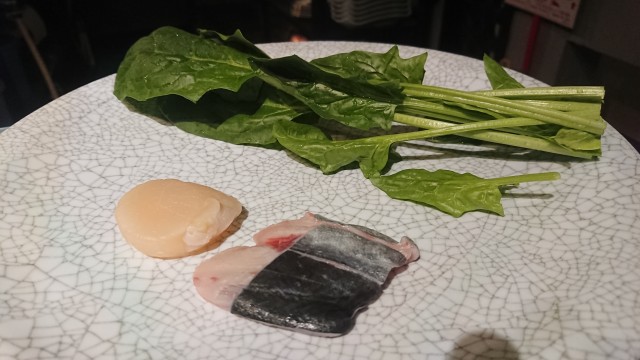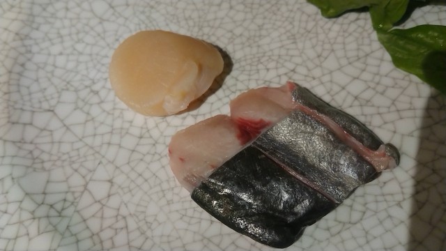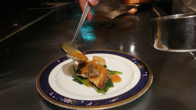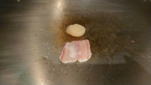 ②青森県産帆立貝と福井県産鰆とほうれん草の鉄板焼き