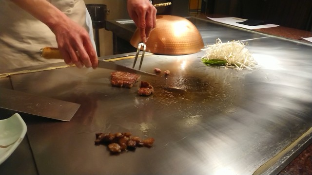 まず、青森県産にんにくを鉄板に乗せる。