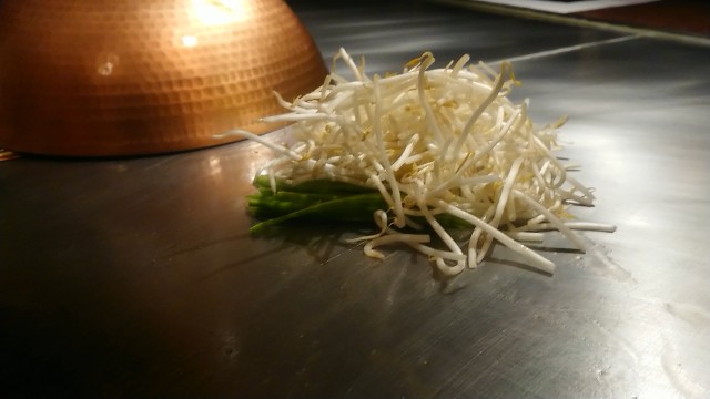 【山海亭 池袋ホテルメトロポリタン店】第22食 「山海亭ランチコース」よりも満足できる”デフォルトメニュー組換え”によるオーダー…青森県産にんにくのホイルバター焼き+愛媛県産真鯛とほうれん草の鉄板焼き+北海道産サーロインステーキ120gの鉄板焼き+もやしとピーマンの鉄板焼き+コーヒー合計7800円 ★2022/12/31(土)12:52