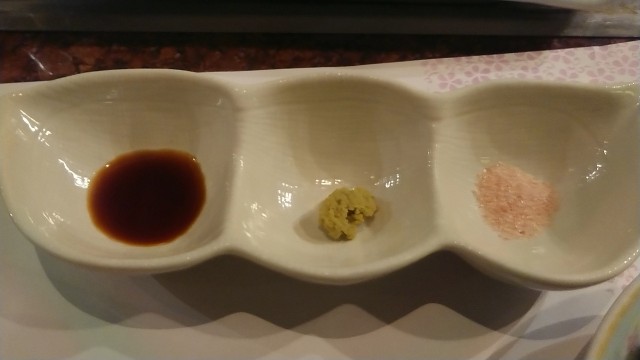 にんにく醤油、わさび、ヒマラヤ産岩塩。