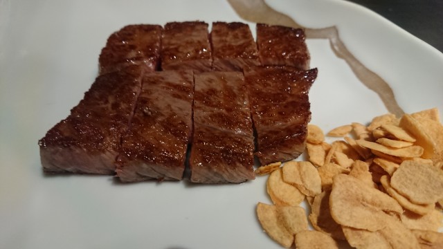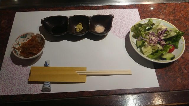 本日のソースは、にんにく醤油、わさび、ヒマラヤ岩塩。