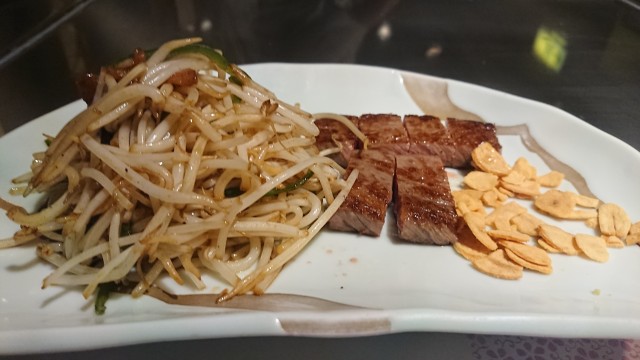 ③北海道産サーロイン120gミディアムレア鉄板焼きステーキ&もやしとピーマンの鉄板焼き