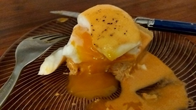 半熟玉子にトマトソースとマヨネーズがかかっている。