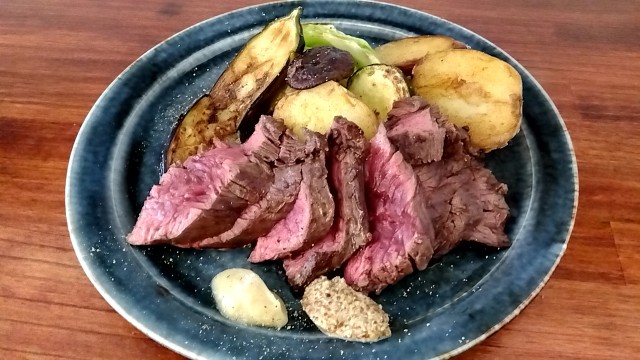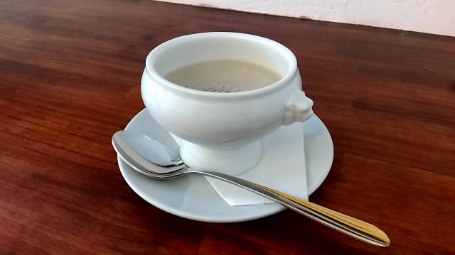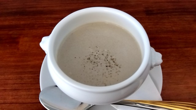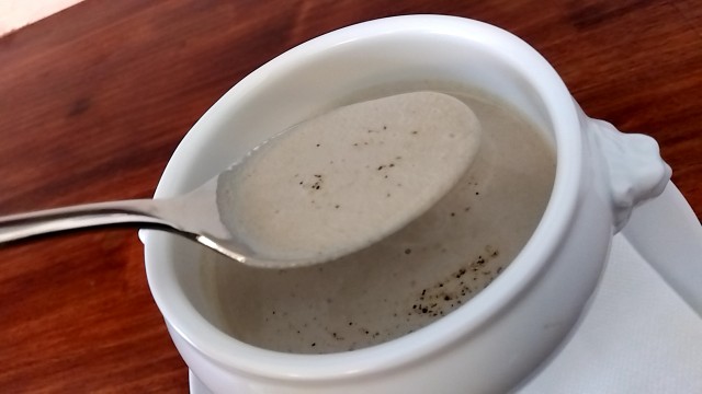 牛ハラミステーキの途中、きのこの冷製スープを追加オーダー!