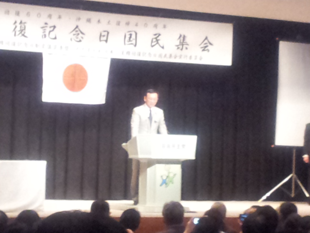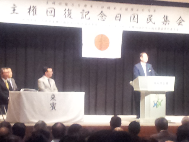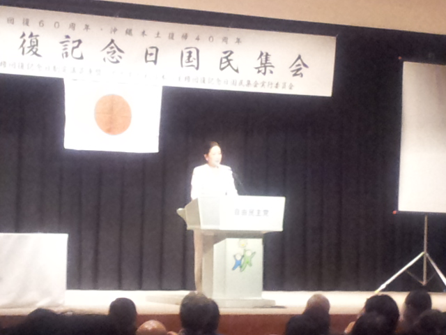 2012/4/10社労士懇親会の席で小池百合子代議士から直々に参加要請があり、2012/4/28 主権回復記念日集会(主権回復60周年・沖縄本土復帰40周年)に出席しました。