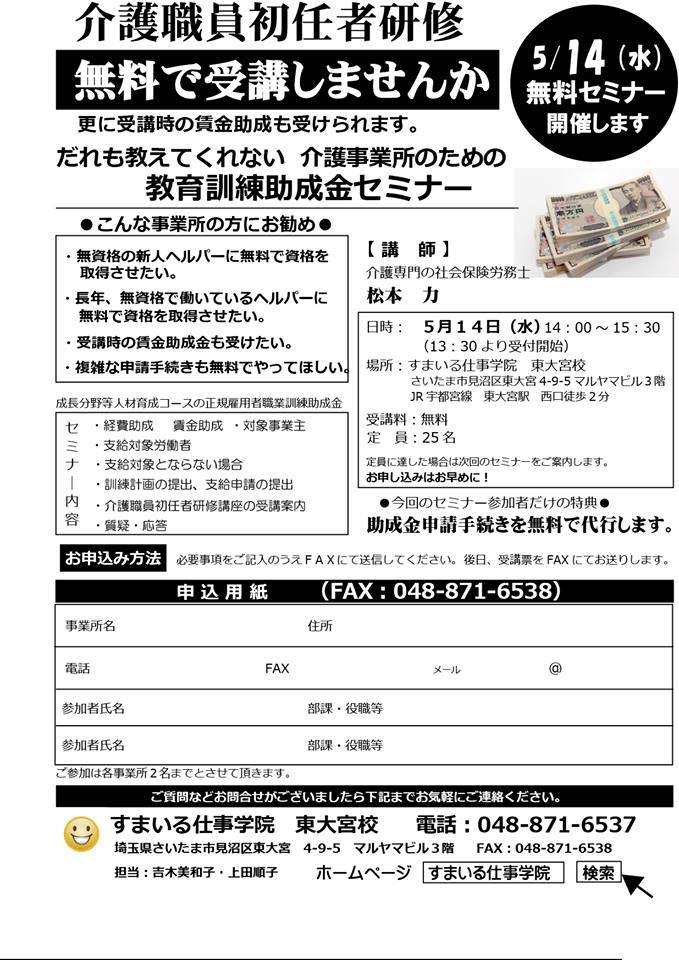すまいる仕事学院におきまして、5/14介護事業所のための助成金セミナーを開催します。ご興味のある方は是非お越し下さい。また、介護事業者にお知り合いのいらっしゃる方、宣伝して頂けたら幸いです。