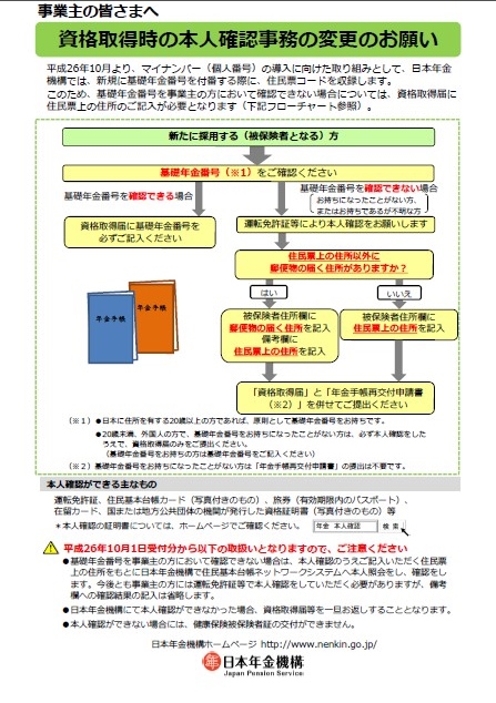 1.基礎年金番号が未記入の被保険者資格取得届について、これまでは、備考欄に本人確認の方法(運転免許証など)を記入することで足りましたが、下記の理由により、手続方法が変更になりました。