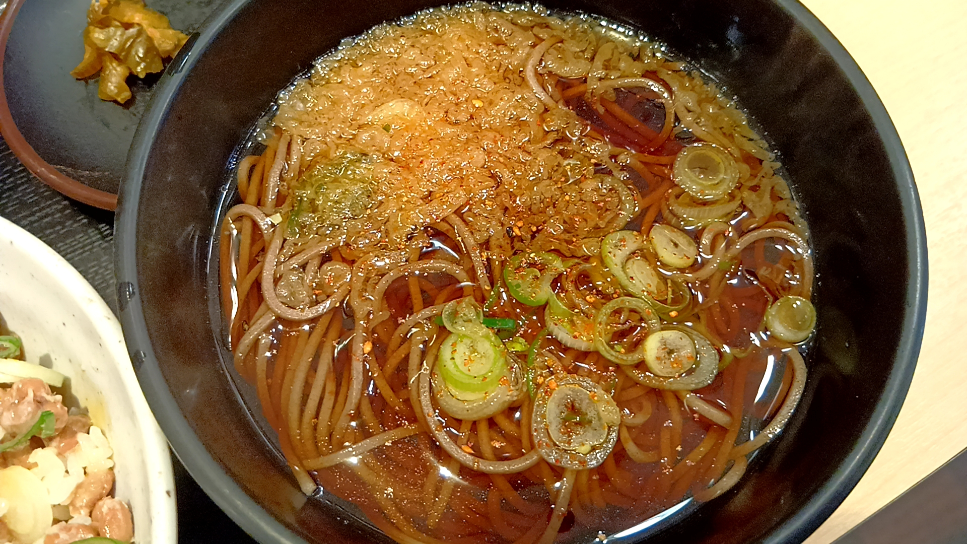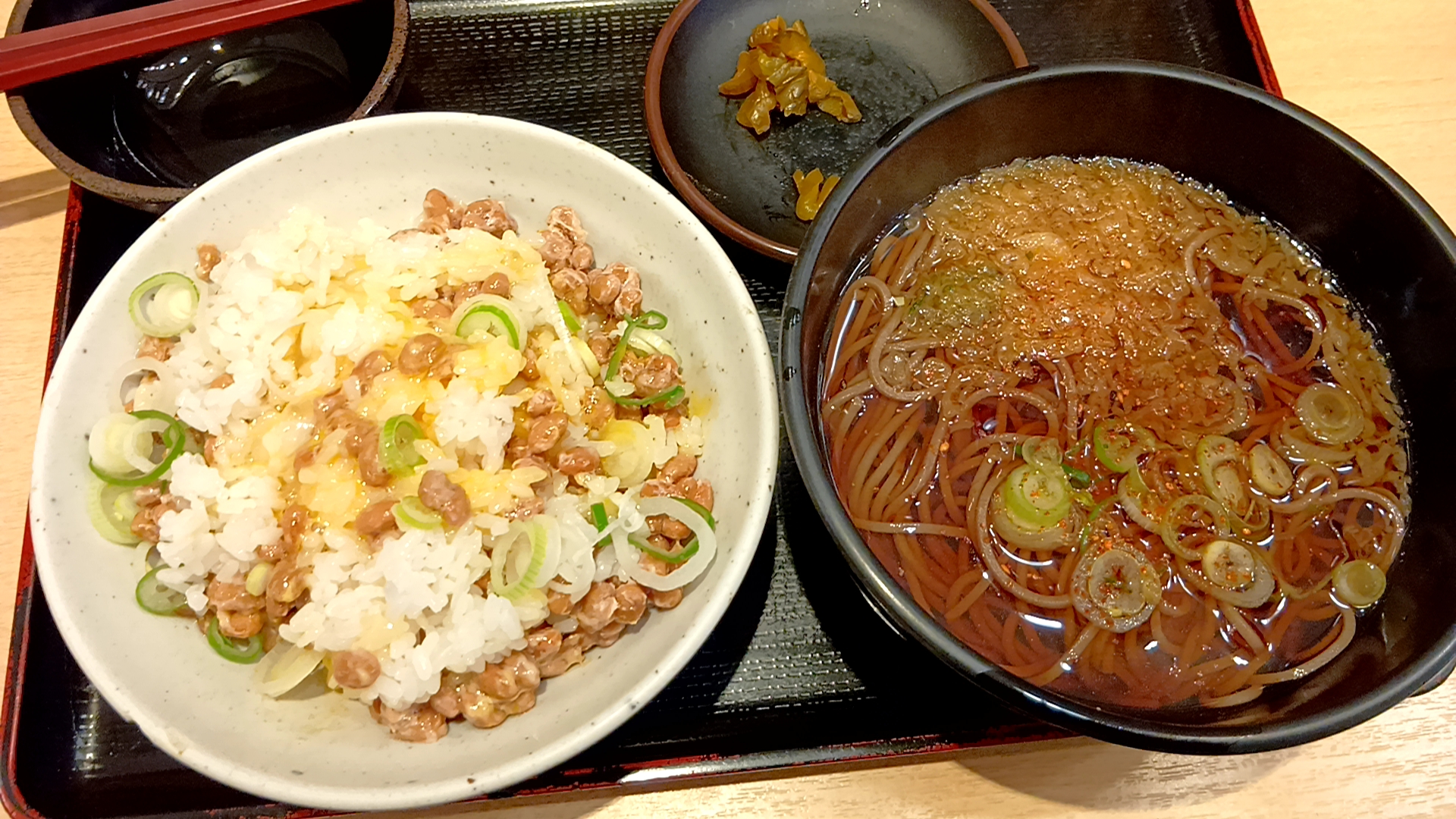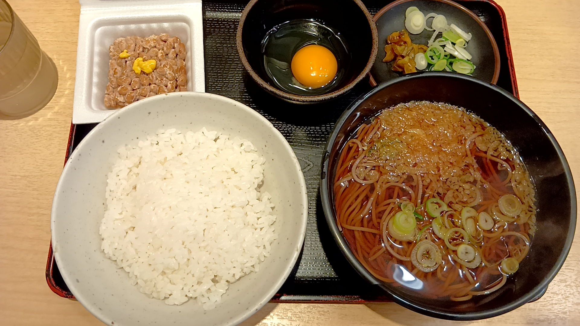 朝B定食(たぬきそば+納豆玉子ご飯+香の物) 540円