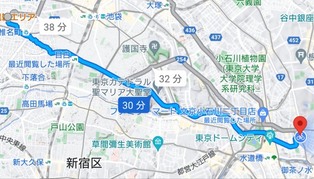 Googleマップをご覧の通り、通常、自宅から本郷三丁目まで30分は必要。