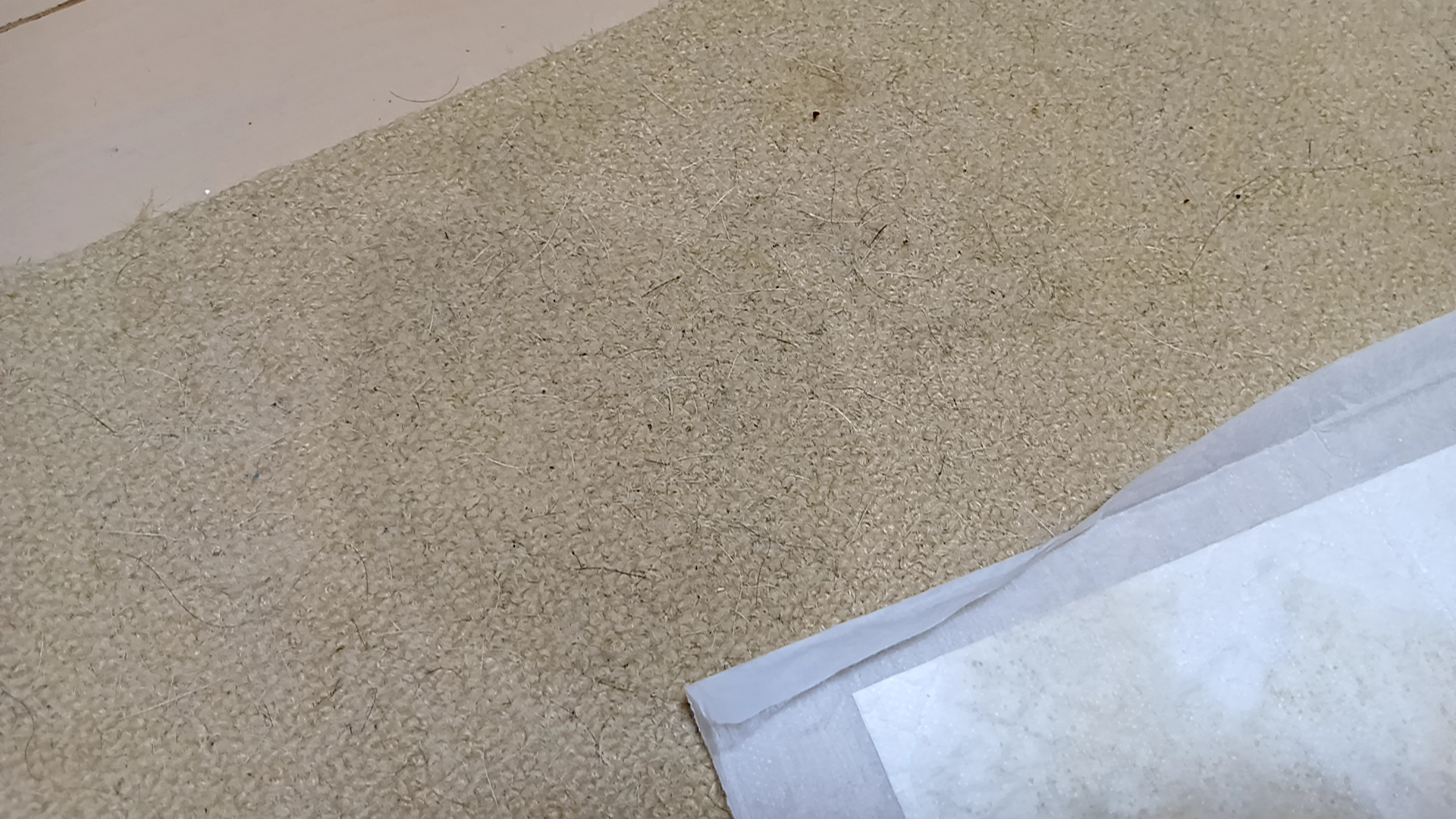 絨毯には、排泄してから数分のおしっこの跡(トイレに間に合わないことがあるのでサークル入口にもシーツを敷いているが、シーツにも点々とおしっこの跡)。