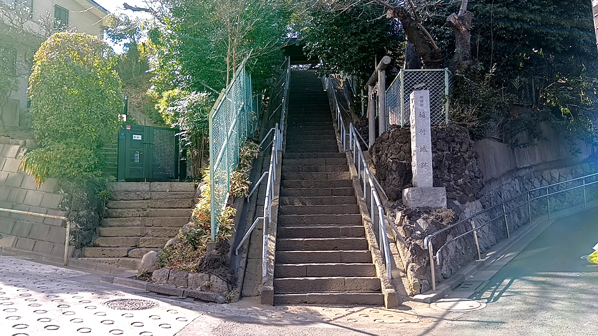この急勾配の高台の上には、太田道灌が文明年間(1469-87)か築城したとされる稲付城があった。