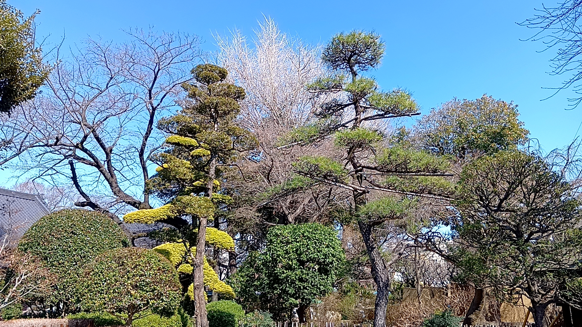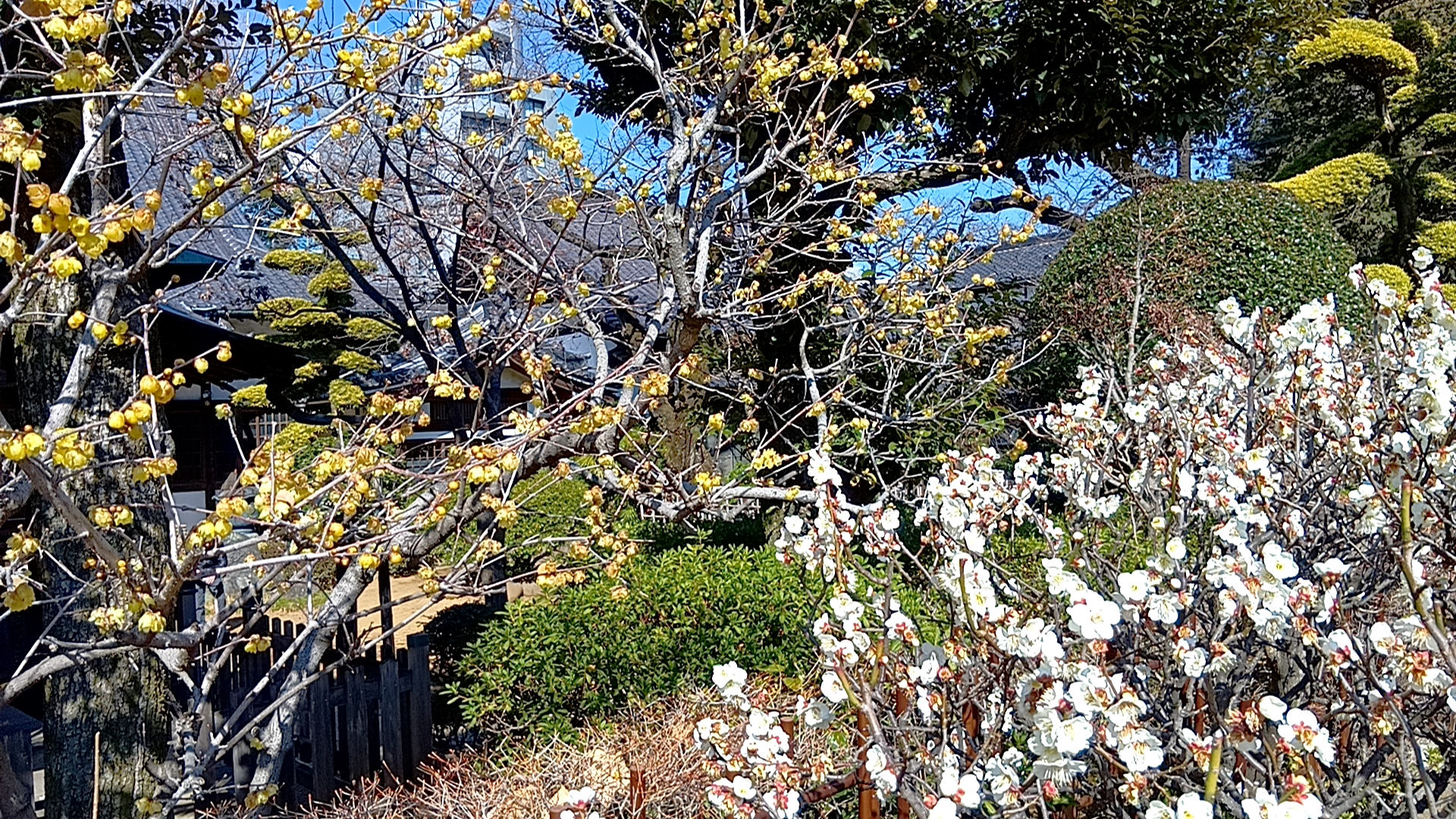 メジロが何匹も飛び交う稲付城跡(静勝寺境内)。